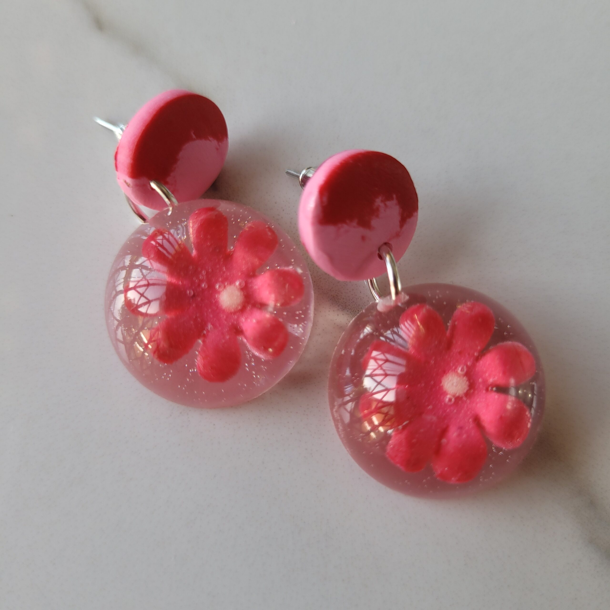 Pink Flower Resin & Clay Earring Drop 34mm
